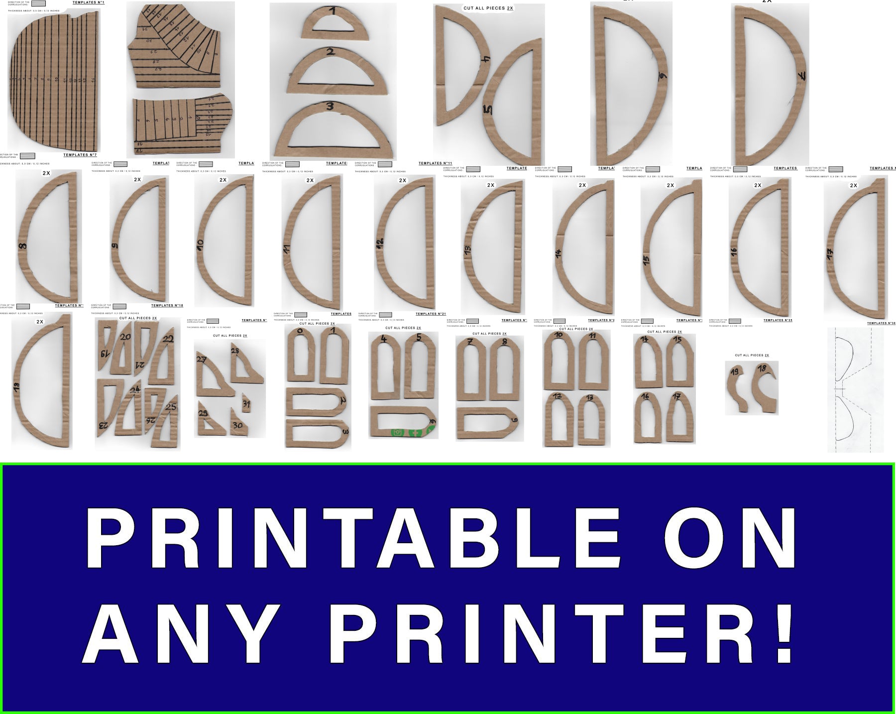 Los patrones en PDF se pueden imprimir en cualquier tamaño de papel conveniente. Las instrucciones sobre cómo configurar e imprimir se proporcionan en el documento del patrón. El patrón del papel debe transferirse al grosor de cartón sugerido que se menciona en cada plantilla.