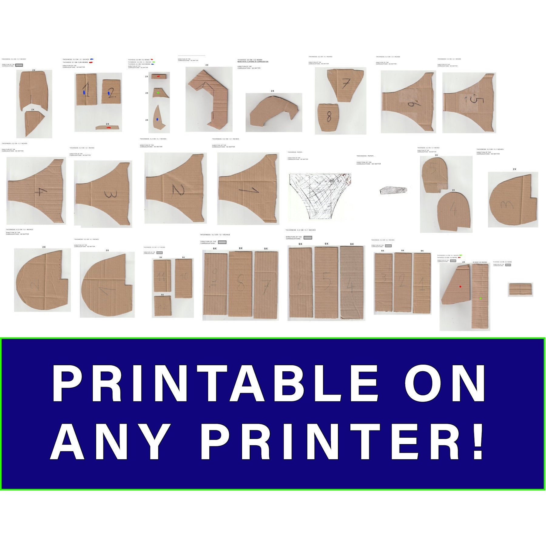 The PDF patterns can be printed to any convenient paper size. Instructions on how to set up and print are provided in the pattern document. The paper pattern should be transferred to the suggested cardboard thickness mentioned on each template.